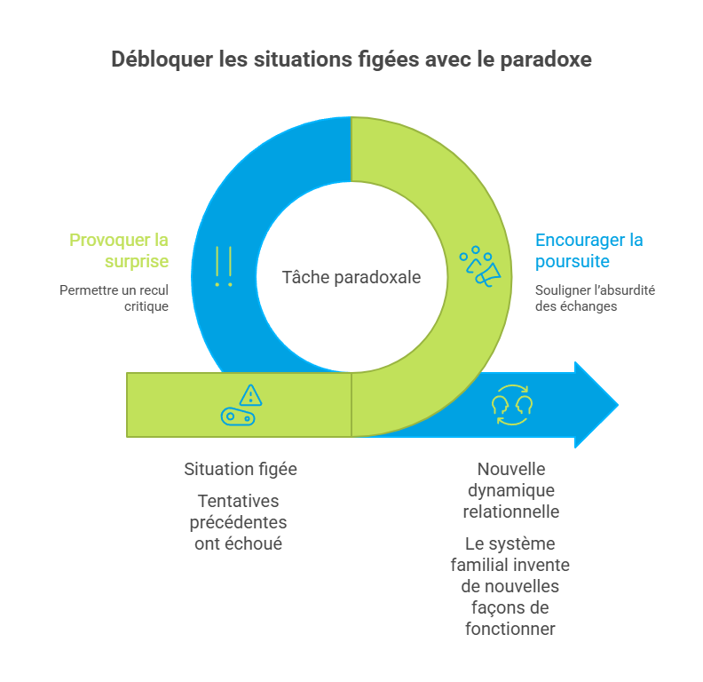 | Tâches paradoxales | Utilisation de consignes créatives pour provoquer un changement | Thérapies brèves, médiation, management |